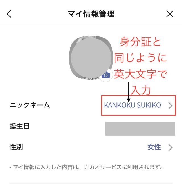 6.ニックネームを身分証明書と同じように英大文字で表記にする